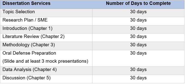 The goal of the 30-Day Dissertation Intensive is to help you finish any dissertation chapter in 30 days. We help minimize all of the headaches and frustrations that come with writing your dissertation. Given the tremendous need for personalized structured, and milestone-based step-by-step guidance on how to write any chapter of your dissertation, the 30-Day Dissertation Intensive was created to fulfill that need. Below is a list of the services we provide and the time frame of completion.